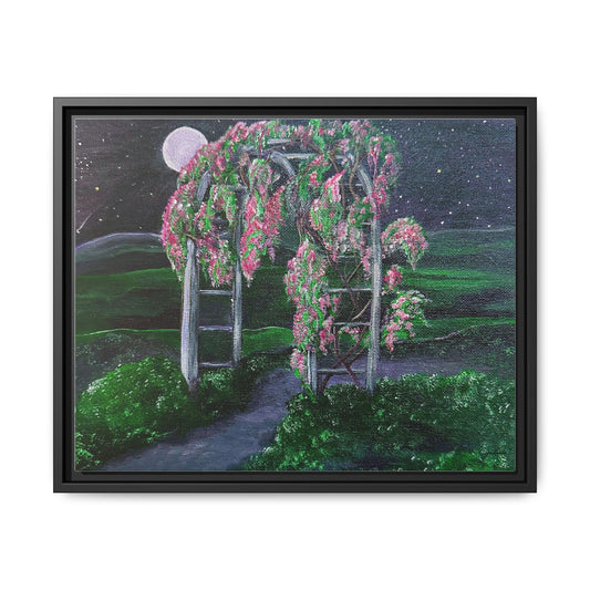 Framed Matte Canvas - Moonlit Garden Arbor Painting titled "Path to Peace"