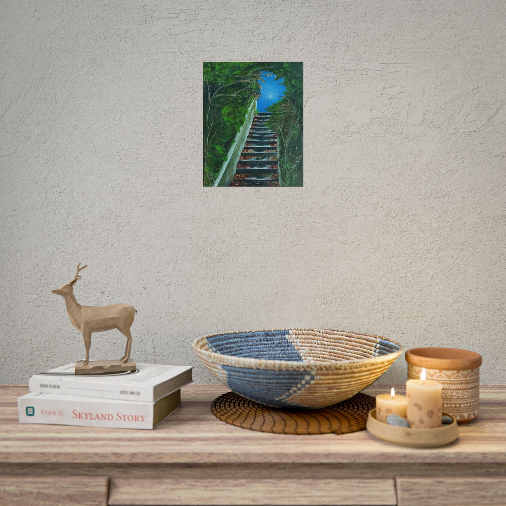 A rolled art poster that brings a quiet, natural doorway into your space. Lush green branches frame a worn stone staircase that climbs toward a glowing blue sky, inviting a slow, reflective breath. The textured brushwork and deep contrasts read well from a distance and reward close-up viewing with visible grain and color depth. Choose from three paper types to match your display style — a satin semi-gloss for vivid color, a soft matte for subtlety, or archival fine art paper for textured, museum-quality presence. Hung in an entryway, studio, or reading nook, this poster becomes a small portal to a calm, green place that you return to between busy days.
