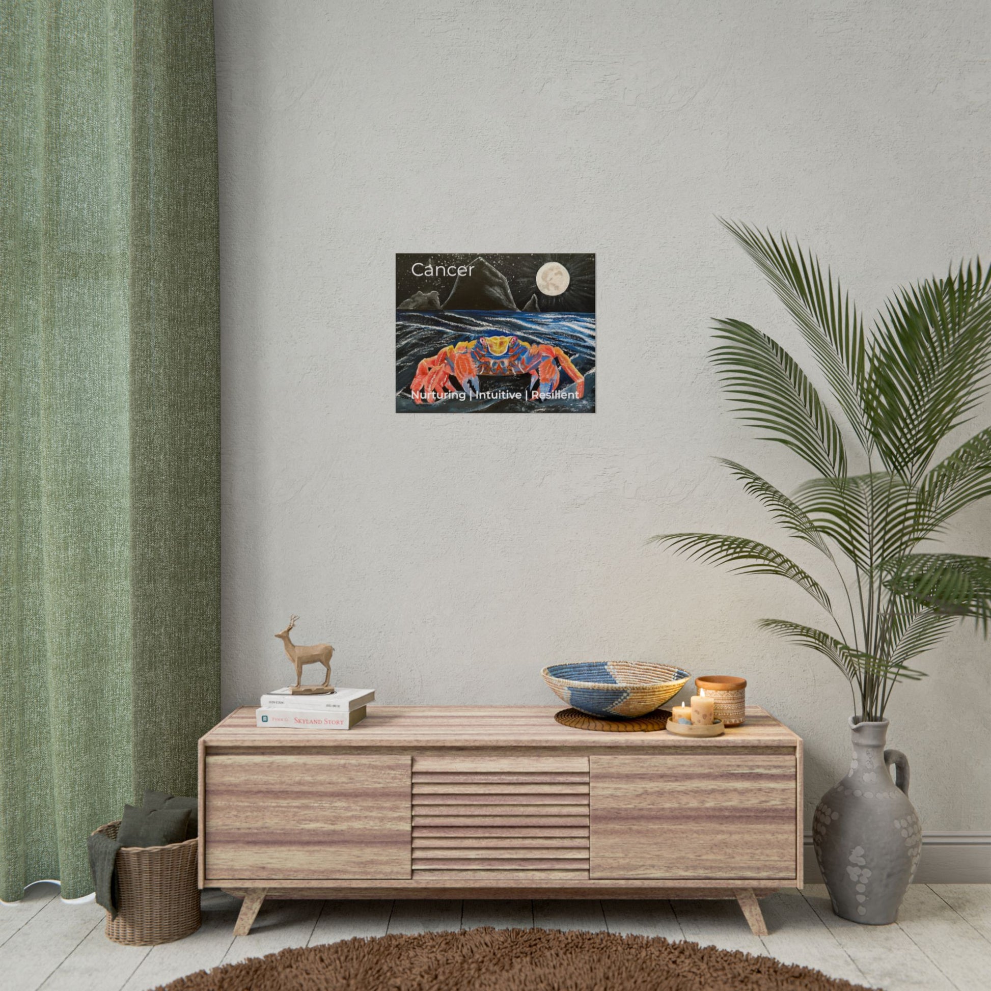 This rolled poster brings a moonlit seaside scene into any space: a vibrant, Zodiac Cancer crab creeps across ink-dark waves beneath a luminous full moon and distant Haystack Rock as a silhouette. The color pops—rich oranges and blues—rendered with giclée precision so the hues stay bright over time. Choose from textured fine art paper for a painterly, archival feel; semi-glossy photo paper for crisp, saturated detail; or matte for a softer, low-reflective finish. Available in multiple sizes and orientations, the print ships rolled for easy framing or mounting and suits coastal-inspired walls, studio corners, or a gallery-style display.