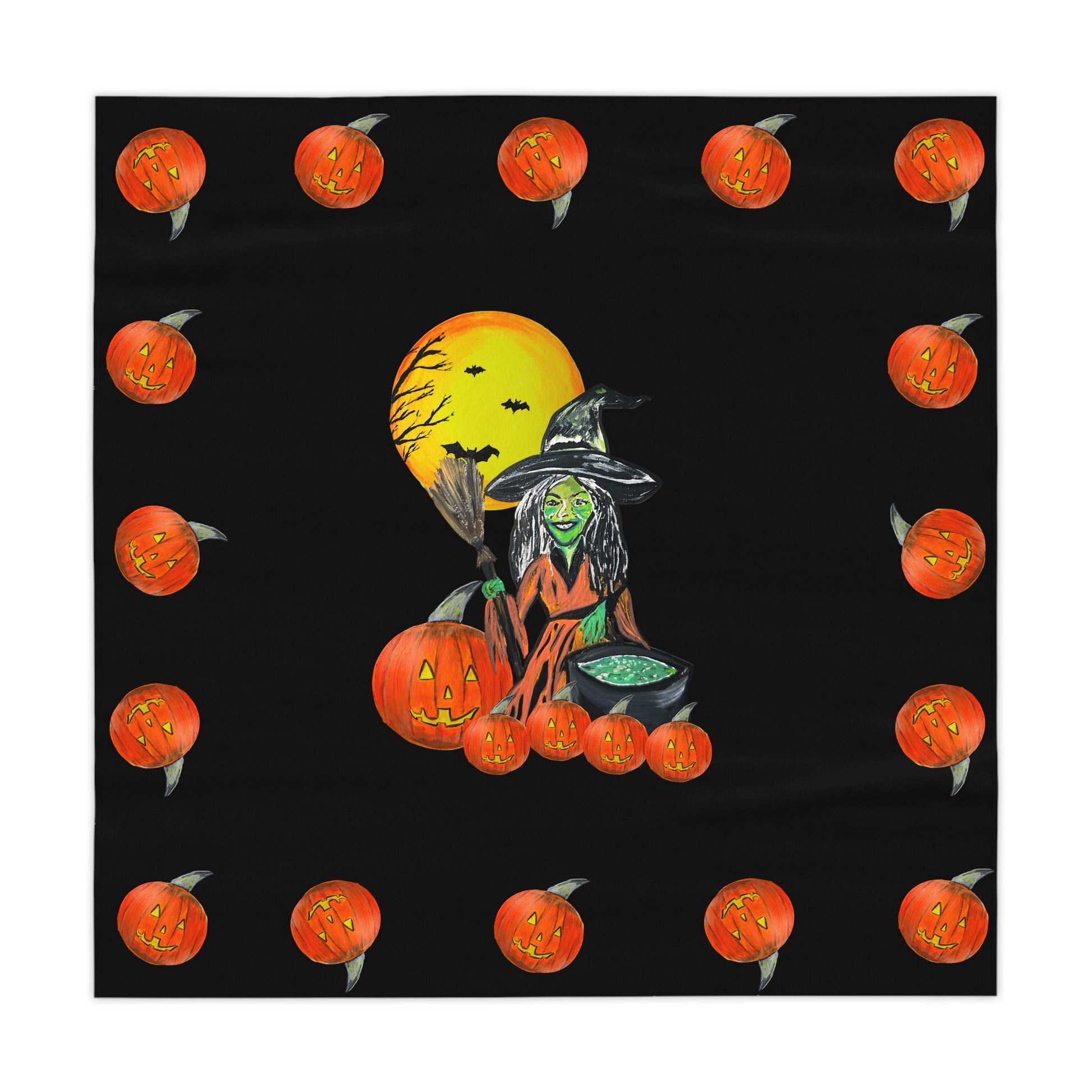Transform your dining table with this Halloween witchy Jack'o'lantern tablecloth. Perfect for Fall, Halloween parties, and spooky table settings. Add a touch of festive decor to your home this autumn season. Ideal for those who love Halloween and enjoy decorating for the holiday.