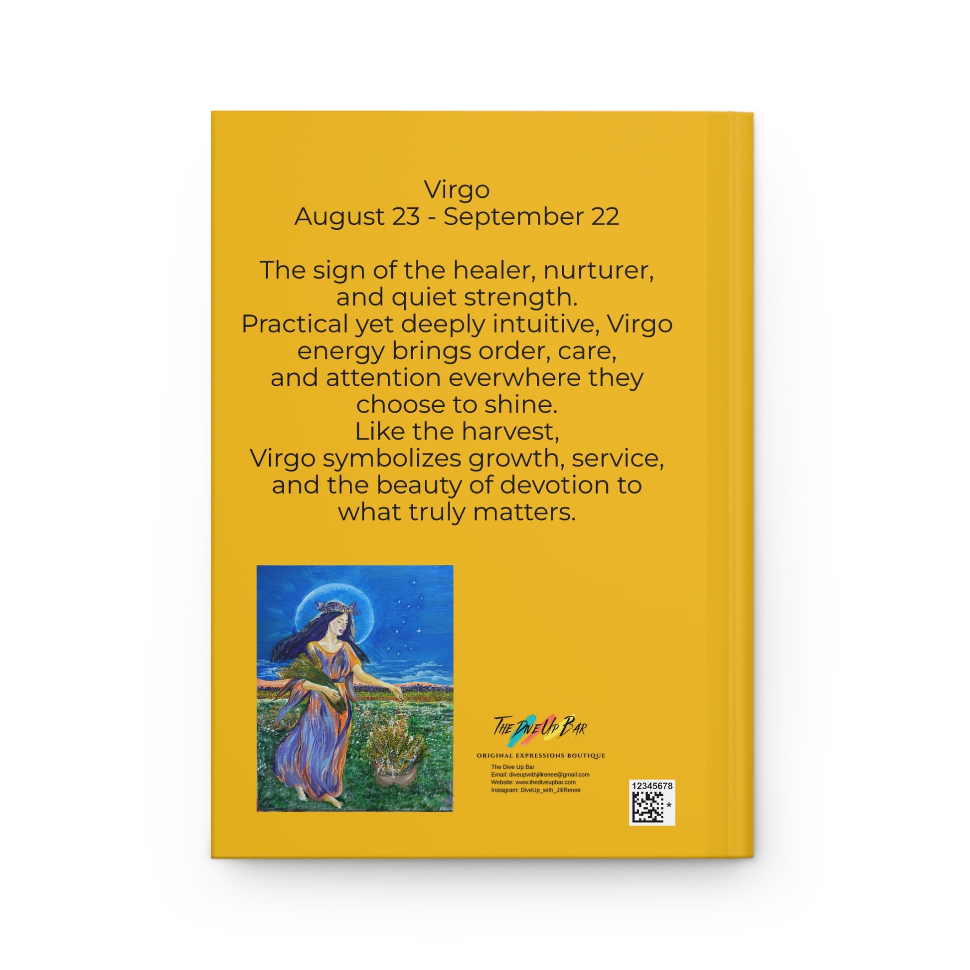 Hardcover Journal Virgo - a perfect place for Virgos to record their thoughts. Beautiful Artwork captures the sacred grounding of Virgo guided by purpose. This journal is ideal for Virgos looking to express themselves and organize their thoughts. Perfect for astrology enthusiasts, birthday gifts, back to school, or personal journaling.