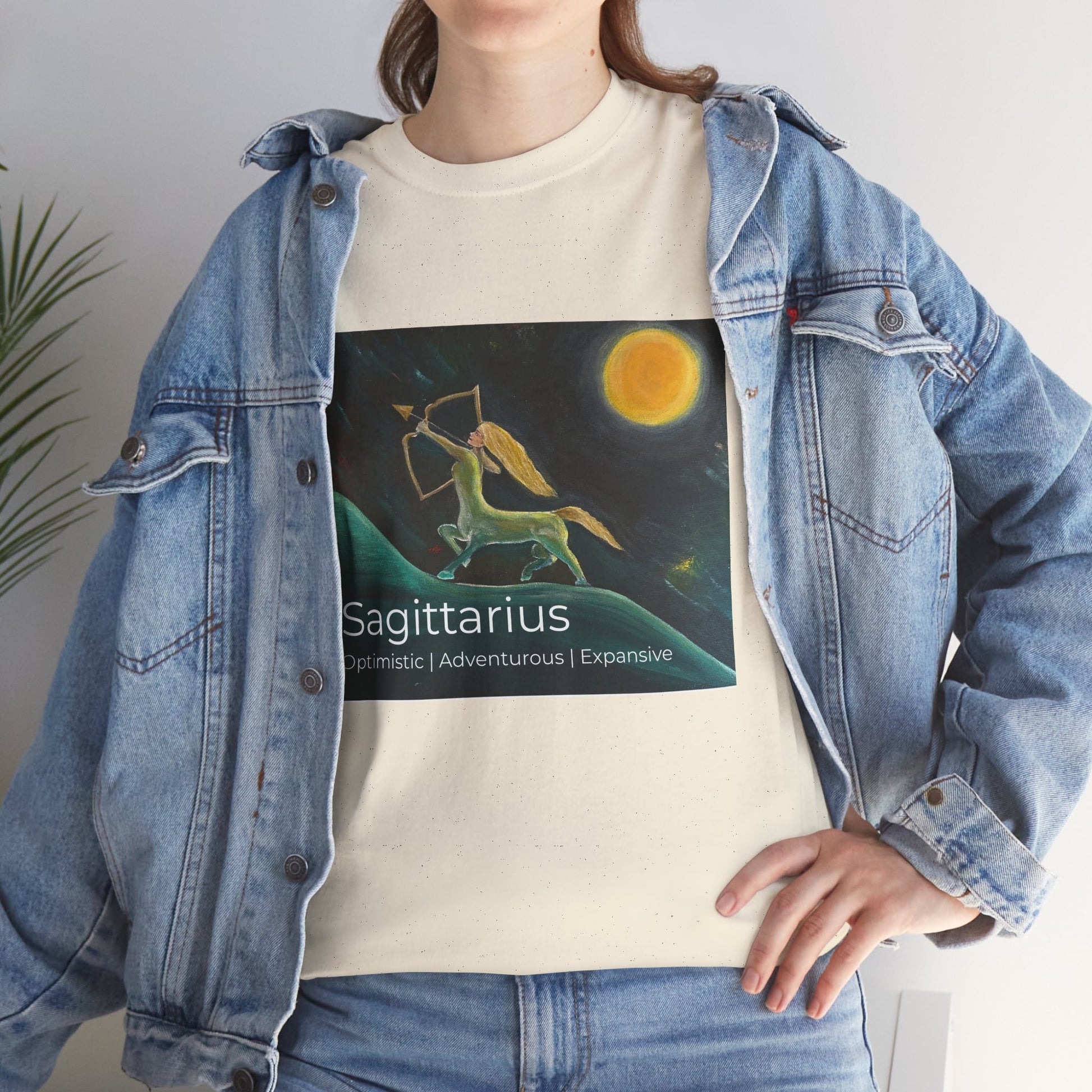 Clean, confident, and quietly bold—this classic tee carries a soft, artful Sagittarius illustration that feels like a warm night under open skies. The print shows the centaur archer poised toward a glowing moon, with muted greens and golds that keep the look subtle yet expressive. Wear it to anchor a layered outfit for a music night, slip it on for a stargazing walk, or let it sit at the center of your everyday rotation when you want clothing that speaks to curiosity and forward motion. The fit drapes easily over the body, the collar keeps its shape, and the tear-away label keeps the back of the neck calm—small comforts that matter when you wear something often. For those who chase horizon lines, celebrate zodiac birthdays, or collect artful basics, this tee blends practicality with a quiet, celestial mood.
