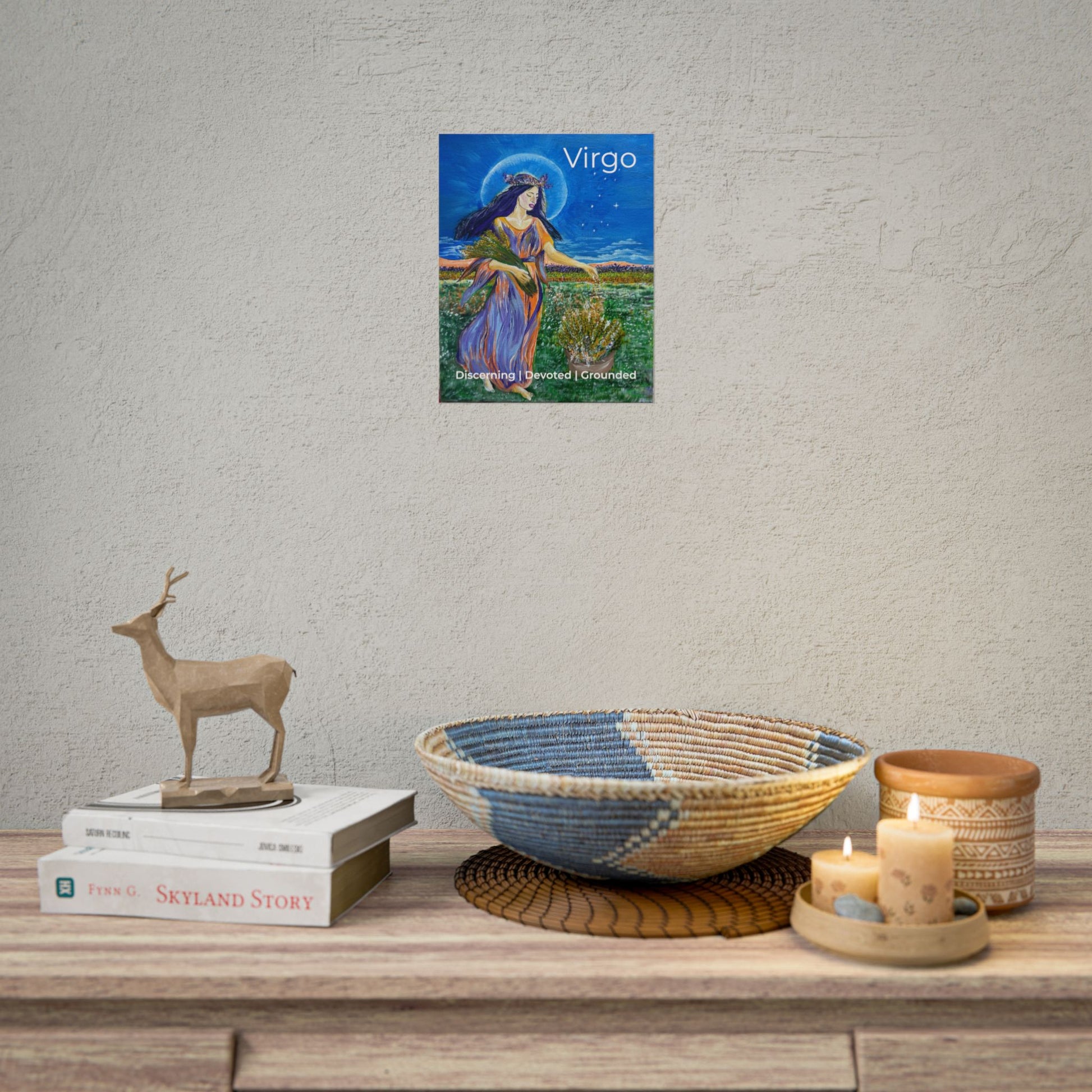 A dreamy, hand-painted poster that feels like a quiet evening folded into color. A robed Virgo Goddess moves through a harvest field, scattering seeds and carrying wildflowers — an image of calm, ritual, and rootedness. The rich blues and soft halo around the figure give the piece a gentle, celestial glow, while textured brushwork and floral details invite close, repeated viewing. Hang it near a reading nook, over a meditation altar, or in a cozy living space to bring a sense of slow ritual and seasonal rhythm into daily life.