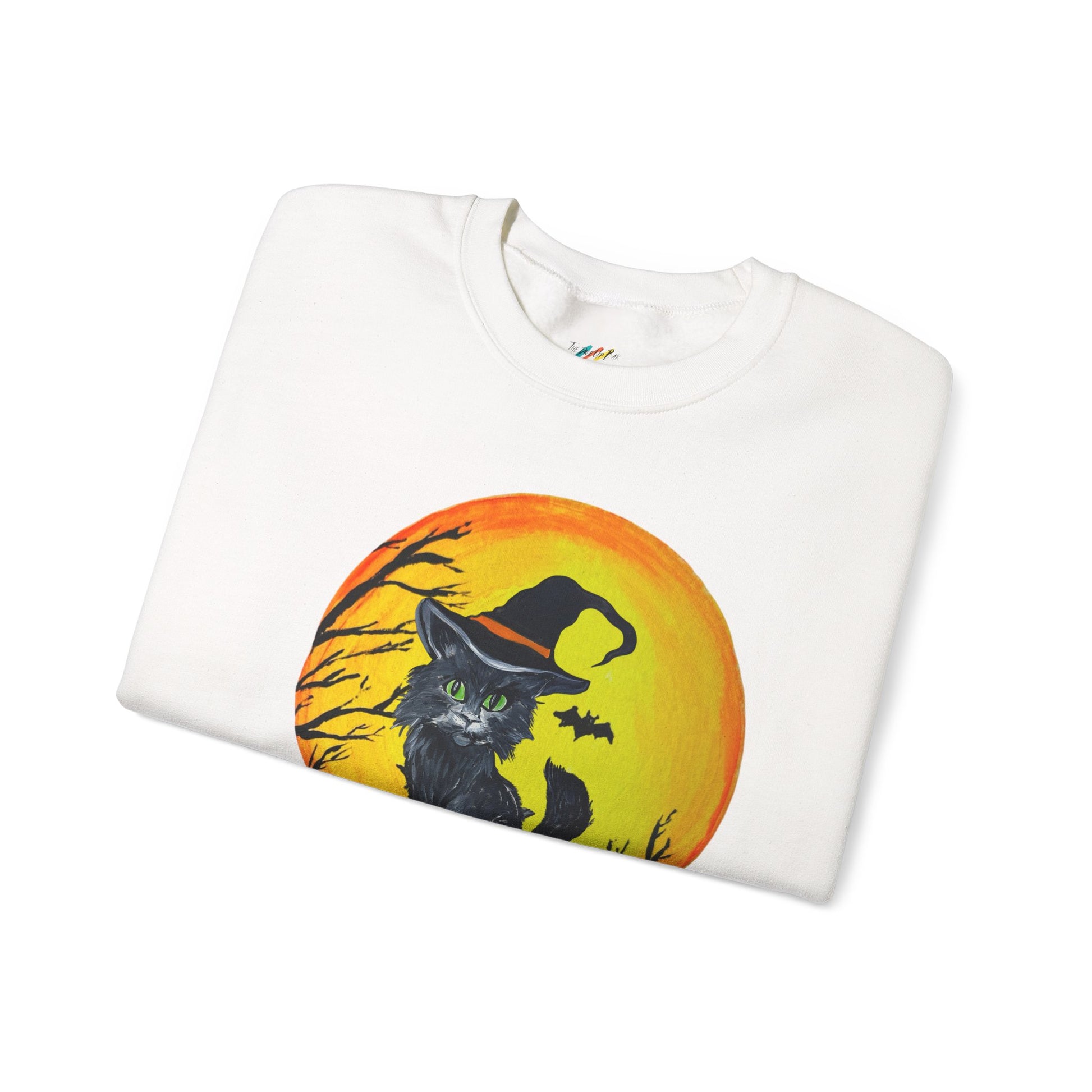 Whimsical Witchy Halloween Kitten Crewneck Sweatshirt, Cute Autumn Moon, Spooky Cat on Jack-O'Lantern, Fall Season Pullover,