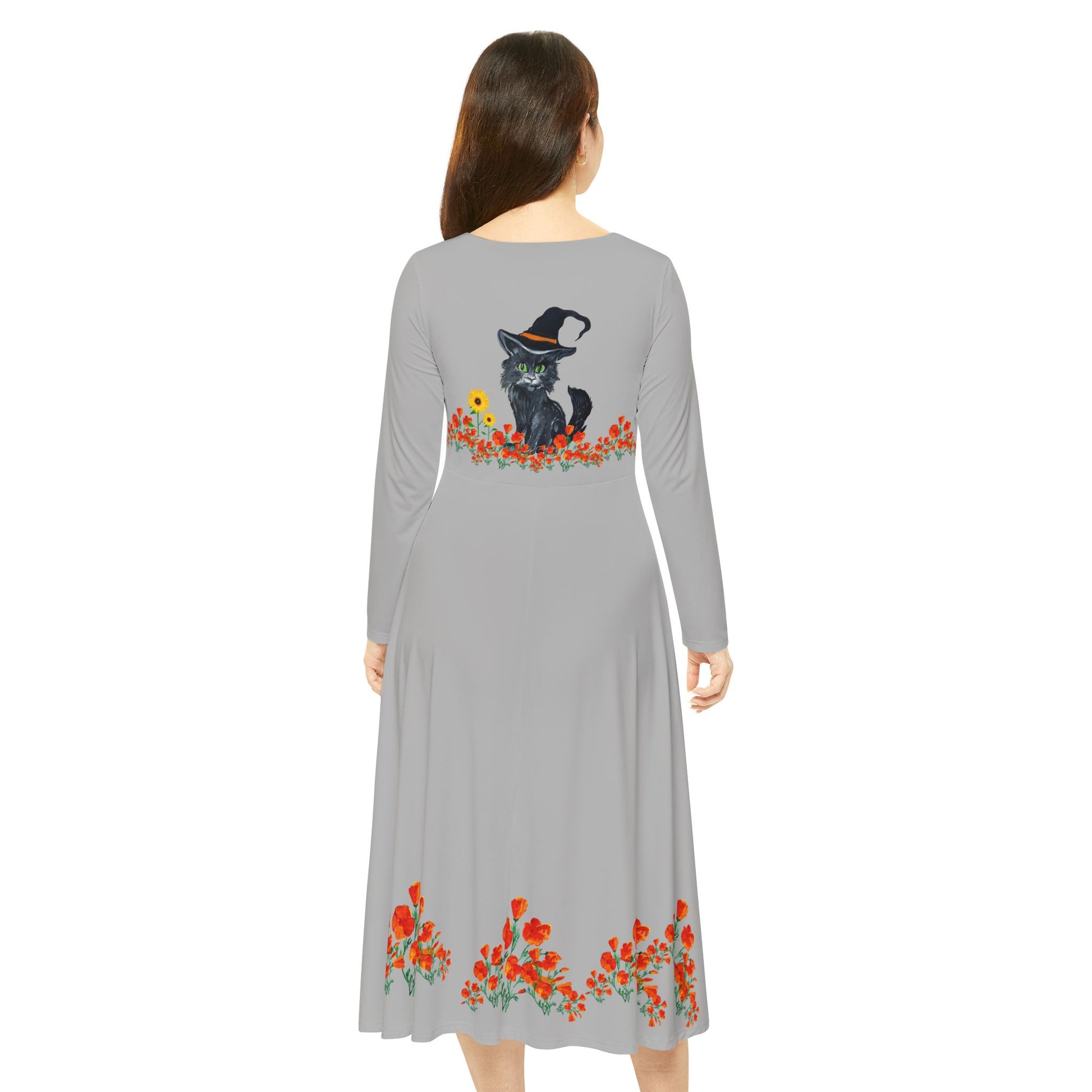 Women's Long Sleeve Witch Cat Dance Dress - Perfect for Halloween, Dance Events, Parties, Autumn Celebrations, Botanical Prints